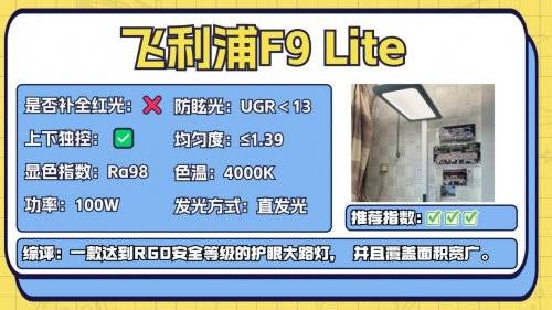 什么牌子的大路灯护眼灯好用?飞利浦F9 Lite是一款主打智能调光的护眼大路灯,支持色温自由调节,另外它还内置智能感应器,可自动识别环境亮度并动态调节灯光,避免明暗变化带来的视觉疲劳。光源部分采用高拟合钻石级全光谱灯珠,结合130°超广角匀光扩散设计,照明覆盖更广,桌面阴影和重影明显减少,从光谱表现来看,这款灯的蓝光控制达到了RG0安全等级,但未补全红光部分,因此虽然亮度高、照明通透,在自然光还原度与长期护眼效果上仍有一定提升空间。