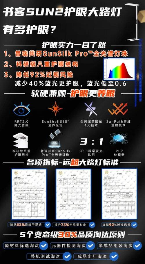 并在护眼养眼的核心技术上,书客突破性研发RRT2.0红光养眼技术,精准拦截380-455nm高能有害蓝光,同时大幅增强有益红光波段,从源头优化光环境,有效减少98%的近视风险,还采用德国进口BASF眩光抑制膜,约640万个微米级透镜结构精准偏转大角度光线,大幅削减眩光效应,实现了低眩光等级(UGR ≤ 9.2),使光线更加柔和均匀!
