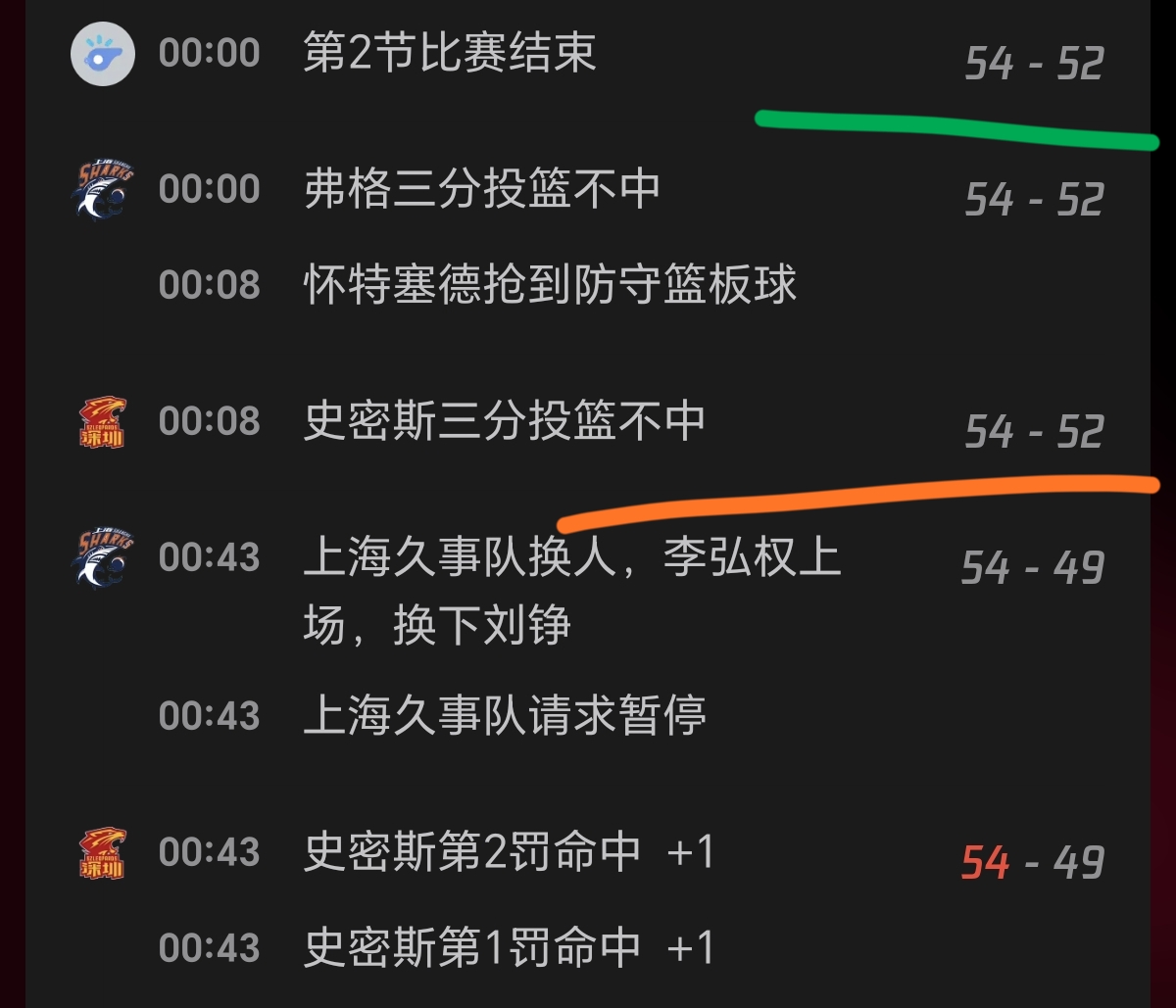 贺希宁三分命中,史密斯罚球命中,半场比赛结束,上海52-54落后深圳2分。