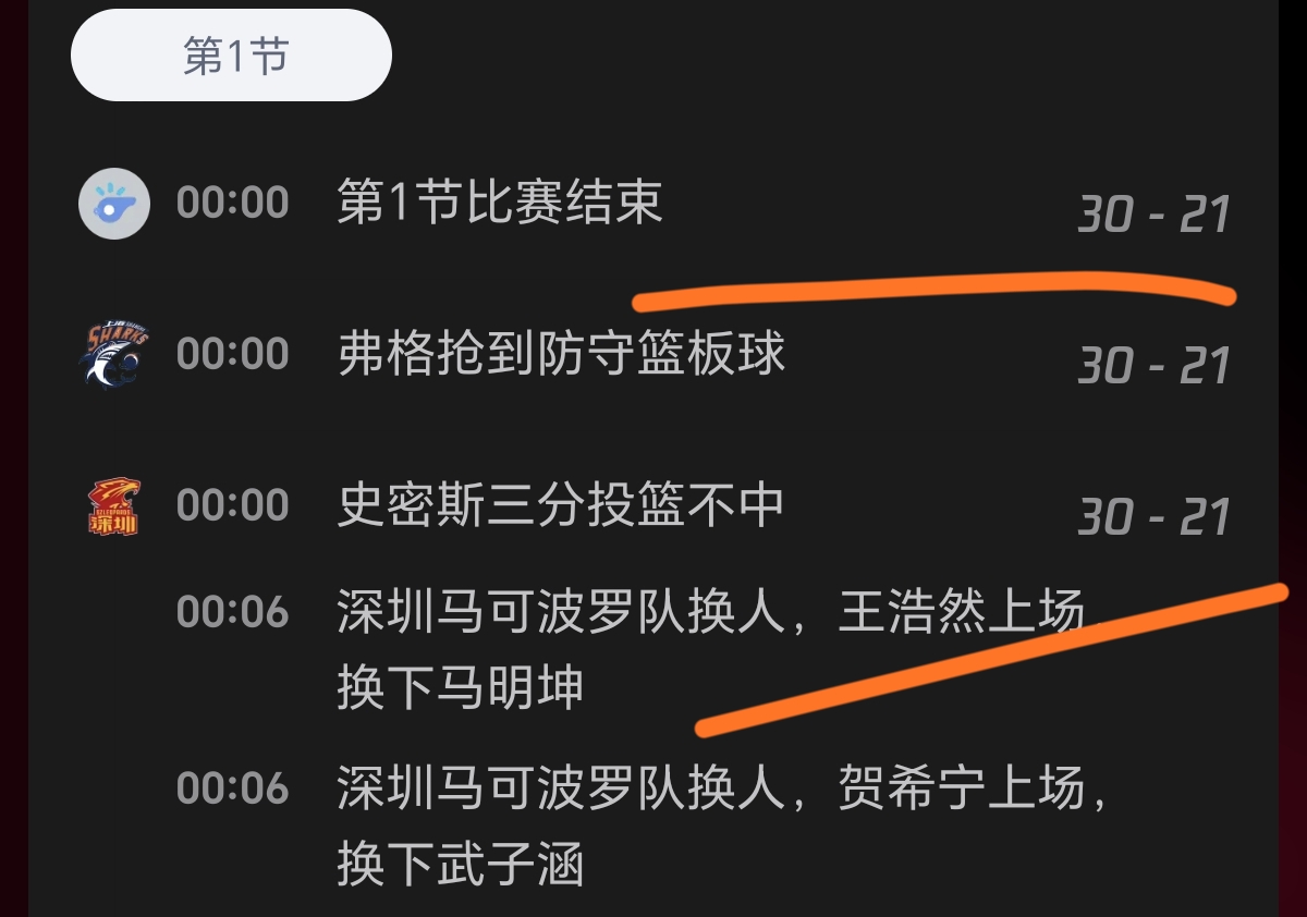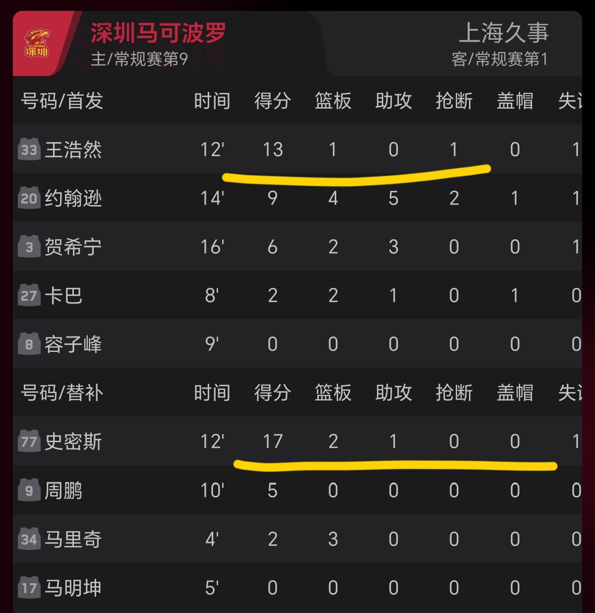 深圳男篮的王浩然6中6得到13分,约翰逊9分4篮板5助攻2抢断1盖帽,贺希宁6分2篮板3助攻,替补的史密斯17分、周鹏5分、马里奇2分。