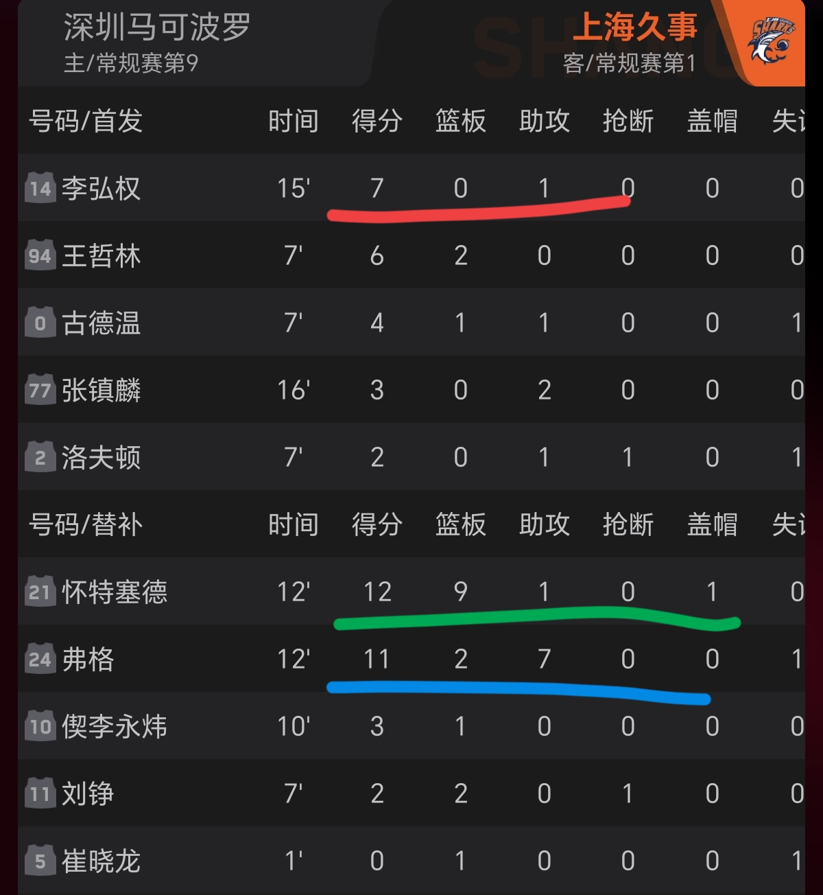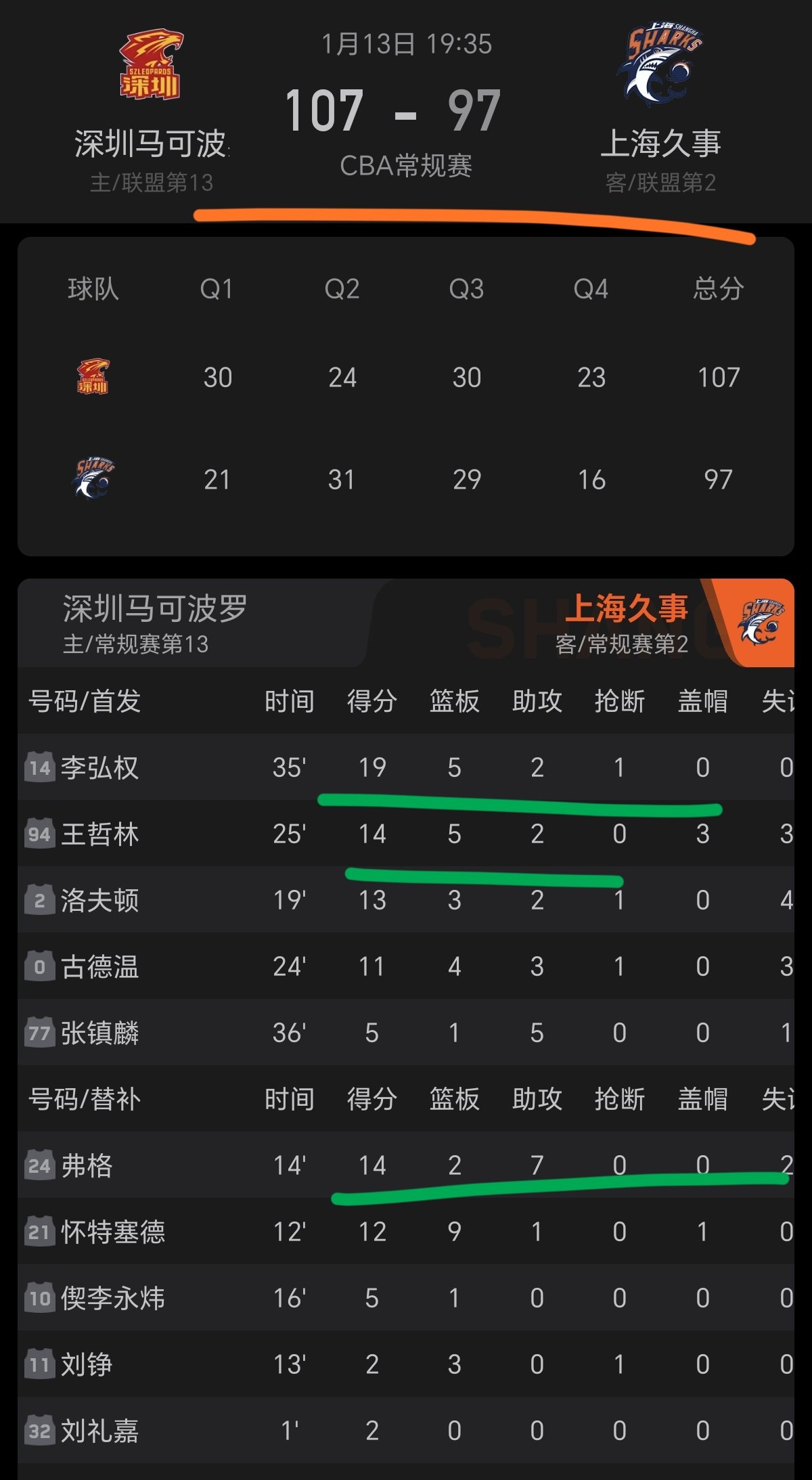 上海男篮的李弘权19分5篮板,王哲林14分5篮板,洛夫顿13分,古德温11分。