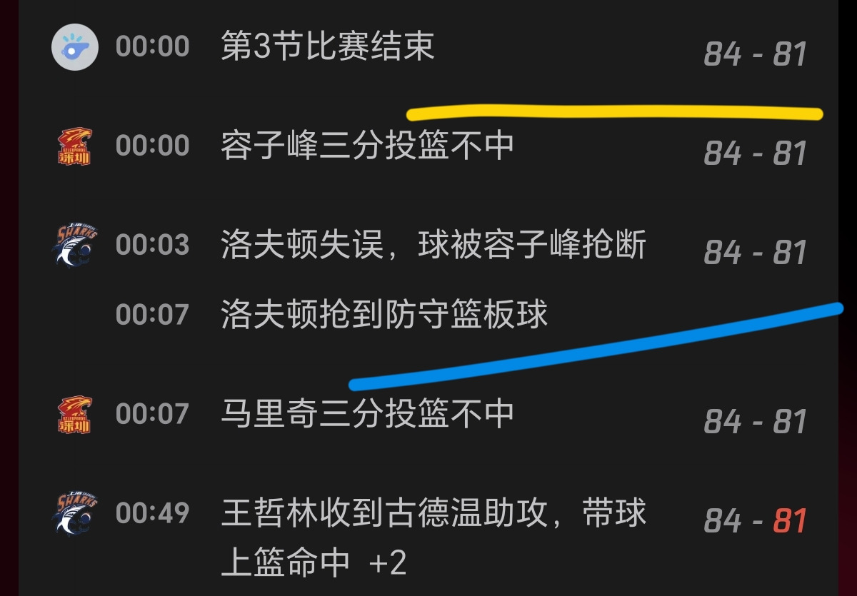 周鹏上篮命中,怀特塞德又拿2分。史密斯连得6分,约翰逊上篮命中,弗格罚球命中,张镇麟三分命中,上海追至49-49平。