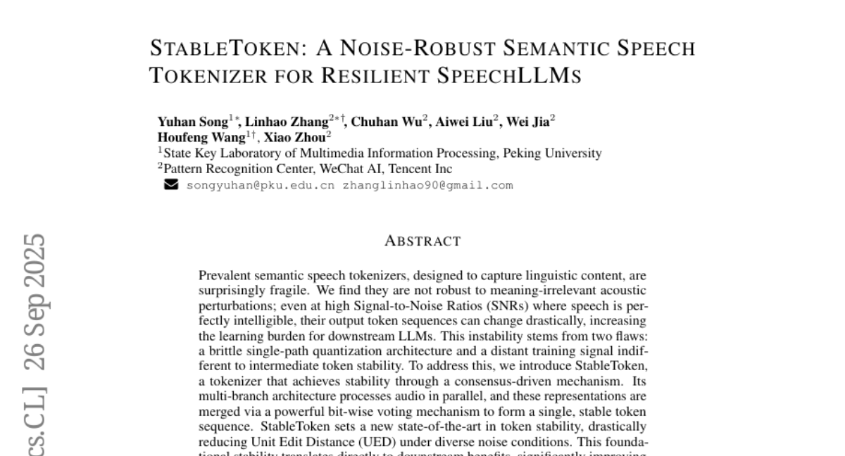 A:StableToken是由北京大学和腾讯联合开发的新型语音AI标记化技术。它主要解决现有语音AI系统在噪音环境下不稳定的问题——即使是很小的背景噪音也会让AI生成完全不同的数字标记,导致语音助手在现实环境中表现糟糕。