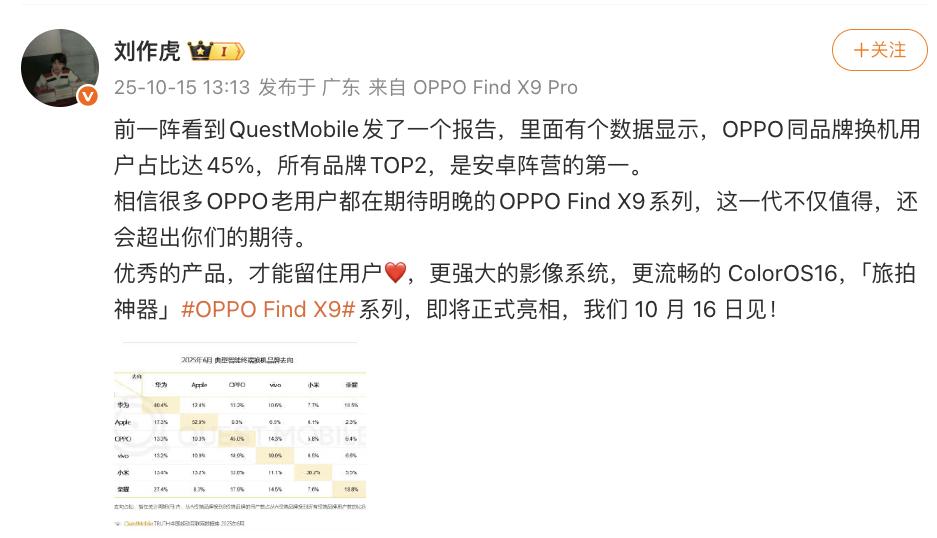 再回到OPPO Find X9 的卖爆,可谓是品牌长期 “品控优先” 战略的必然回报,这一战略的可持续性,在权威数据与产品表现中得到双重印证。消费保 10 月 23 日数据显示,2021-2025 年 Q1 国内手机累计投诉 32680 件,OPPO 在六家主流厂商中投诉量最低,且与第一名差距超 30%—— 这份跨越近四年的数据,说明 OPPO 的低投诉并非偶然,而是长期战略落地的结果。