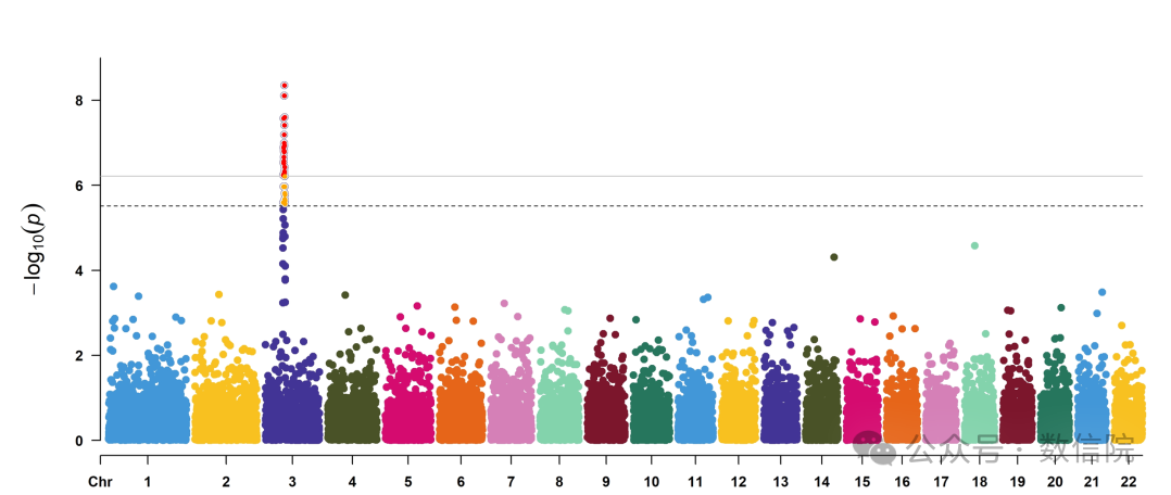 展示SNP与表型的关联性,图中每个点代表一个SNP,y轴代表其与表型的关联强度(通常是log(p-value)),越高的点表示关联越强。