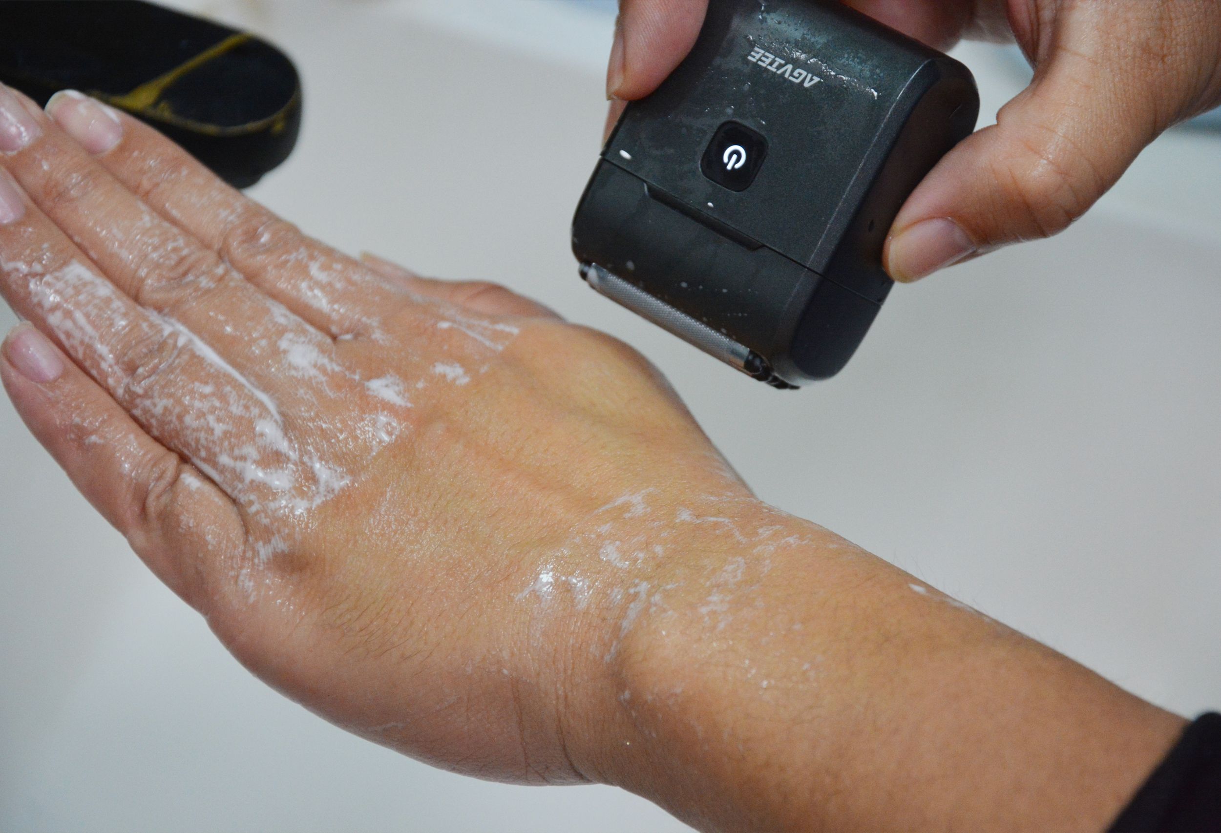 我们给手背涂一层剃须膏,做一个贴合度实验。手背带有弧度是检验贴合度比较好的位置,用剃须刀刮一下,可以看到剃须膏几乎被完美带走,证明贴合度确实比较优秀。