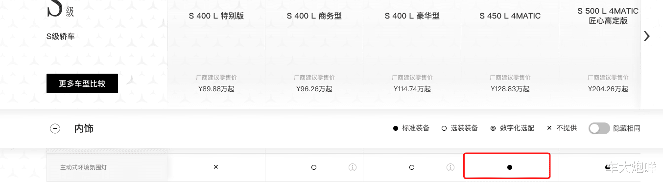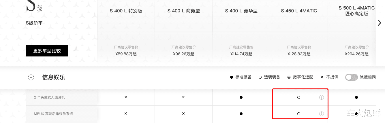 与2025款车型相比,2026款奔驰S 450 L 4MATIC新增标配主动式环境氛围灯(此前选装价格:1.02万元);裸眼3D数字仪表屏(价格:1.43万元)、MBUX高端后排娱乐系统(绑定2个头戴式无线耳机,价格:4.06万元)等功能配置由标准配置变更为选装配置,官方指导价下调5.49万元。