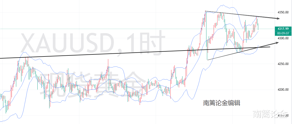 下方要去关注的除了三角形的下轨之外,激进一些的支撑,还有小时图的布林带中轨一带,大概是4310。结合到成交量密集区的实体部分是在4301。所以说,4301—10成为今天的临时分水岭。多空轮转并不强,务必系好安全带。
