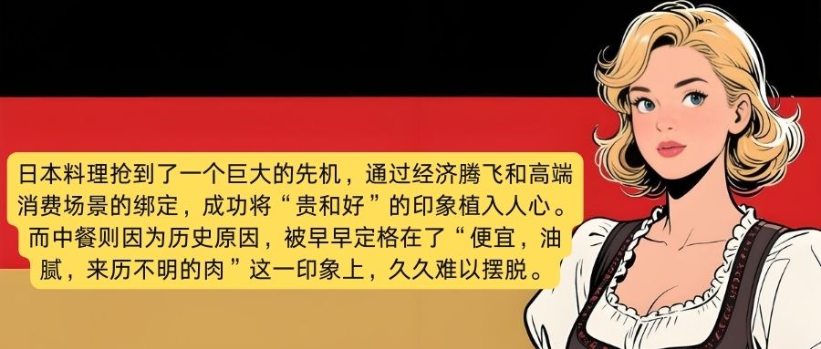 一位德国网友就直言不讳地指出,日本料理抢到了一个巨大的先机,通过经济腾飞和高端消费场景的绑定,成功将“贵和好”的印象植入人心。而中餐则因为历史原因,被早早定格在了“便宜、油腻、来历不明的肉”这一印象上,久久难以摆脱。