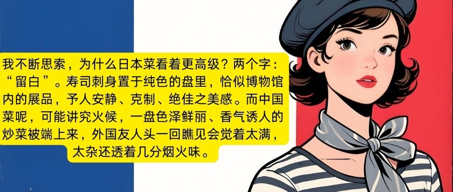 一位法国网友的观察尤为独到,她说道,我不断思索,为什么日本菜看着更高级?两个字:“留白”。寿司刺身置于纯色的盘里,恰似博物馆内的展品,予人安静、克制、绝佳之美感。而中国菜呢,可能讲究火候,一盘色泽鲜丽、香气诱人的炒菜被端上来,外国友人头一回瞧见会觉着太满,太杂还透着几分烟火味。