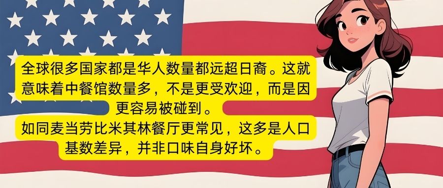 而另一位美国网友凯文表示:全球很多国家都是华人数量都远超日裔。这就意味着中餐馆数量多,不是更受欢迎,而是更容易被碰到。如同麦当劳比米其林餐厅更常见,这多是人口基数差异,并非口味自身好坏。