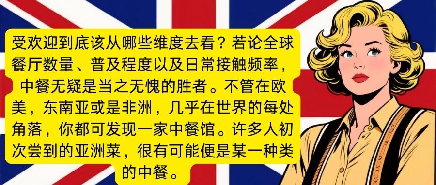 一位英国网友约翰提出了一个关键问题:“受欢迎到底该从哪些维度去看?若论全球餐厅数量、普及程度以及日常接触频率,中餐无疑是当之无愧的胜者。不管在欧美,东南亚,非洲,几乎在世界的每处角落,你都可发现一家中餐馆。许多人初次尝到的亚洲菜,很有可能便是某一种类的中餐。