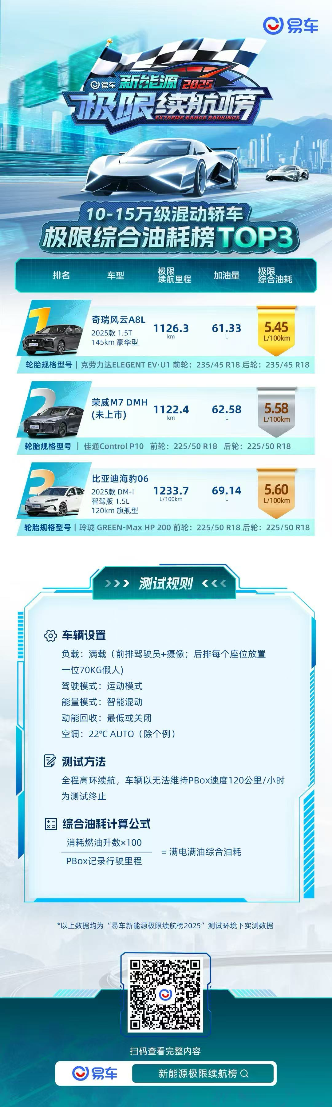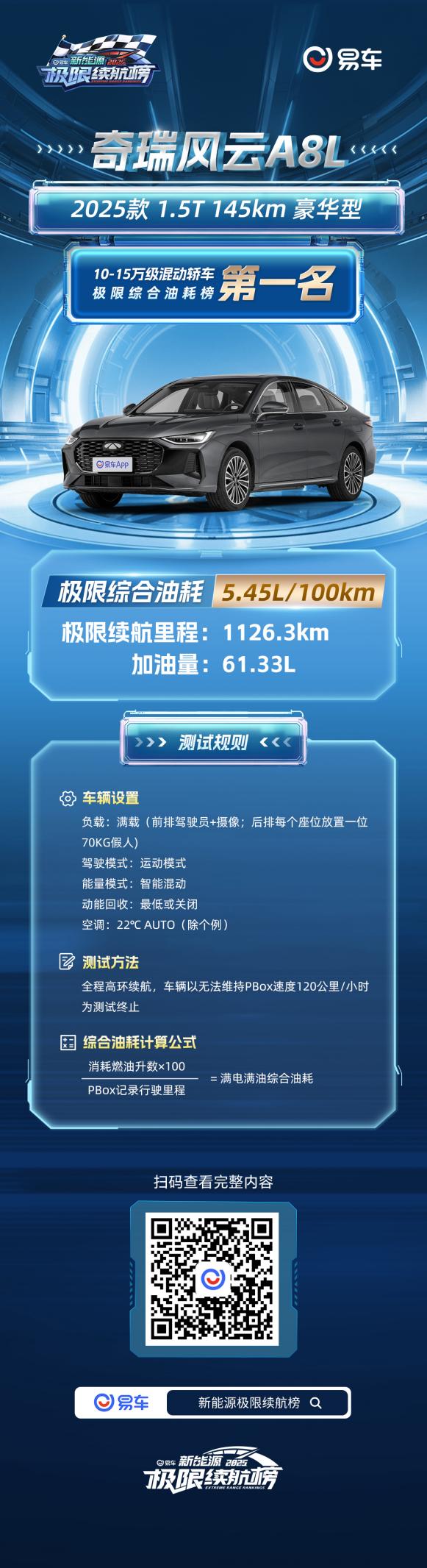 2025年8月,环形高速跑道上引擎轰鸣,65台新能源车在满载状态下开启极限挑战。当银灰色车身的奇瑞风云A8L以120km/h巡航冲过终点线时,仪表盘定格的1126.3公里续航里程引爆直播间——在模拟全家出行的严苛测试中,这辆混动轿车以5.45L/100km的综合能耗,强势卫冕《2025易车新能源极限续航榜》混动组TOP1。这场胜利不仅延续了兄弟车型风云A8在2024年的夺冠传奇,更以技术迭代刷新了混动领域的能耗标杆。