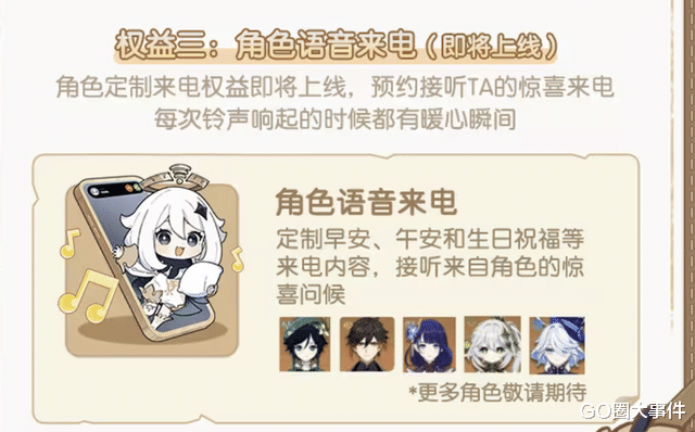 也就是说不需要等到官方推出相应的角色语音活动,也能接到角色打来的电话了!目前这个权益暂定的角色是已上线的五神,下方有提示更多角色敬请期待,看来后续应该会有更多角色加入。