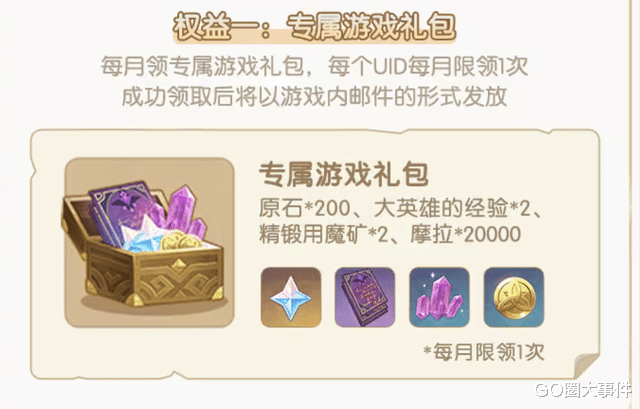 第一个是专属游戏礼包,领取后可以获得200原石、20000魔拉,以及游戏养成道具,每个UID每月限领一次。作为手机卡的额外奖励来说还是很不错的,每月可以多攒一点原石。