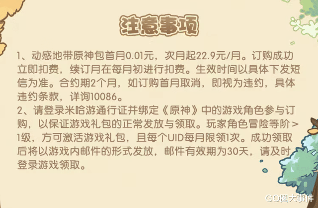 《原神》主题包的定价是首月0.01元,次月起22.9元,续订的话每月初就会进行扣费了,想预定这个联动包的玩家需要注意一下。这里还要提醒一下大家,主题包的合约期是两个月,也就是说替换成联动套餐的话,至少要用两个月,只订购首月就取消的话会视为违约。