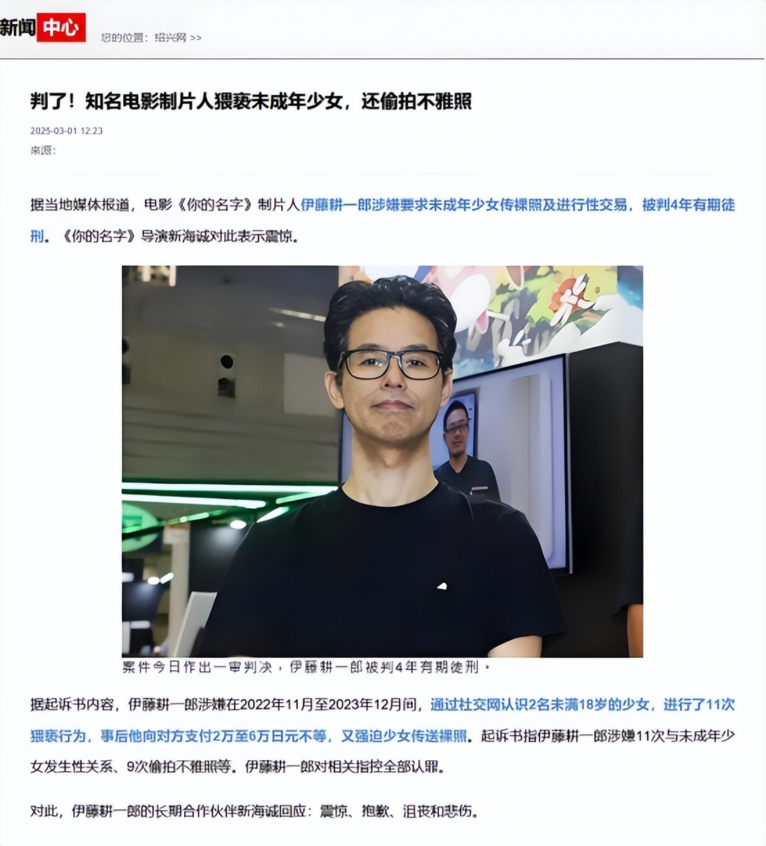 可能觉得这只是艺术创作,但现实比大家想得更黑暗,比如那部感动了很多人的动画电影《你的名字》,它的制片人伊藤耕一郎就被抓了个现行。