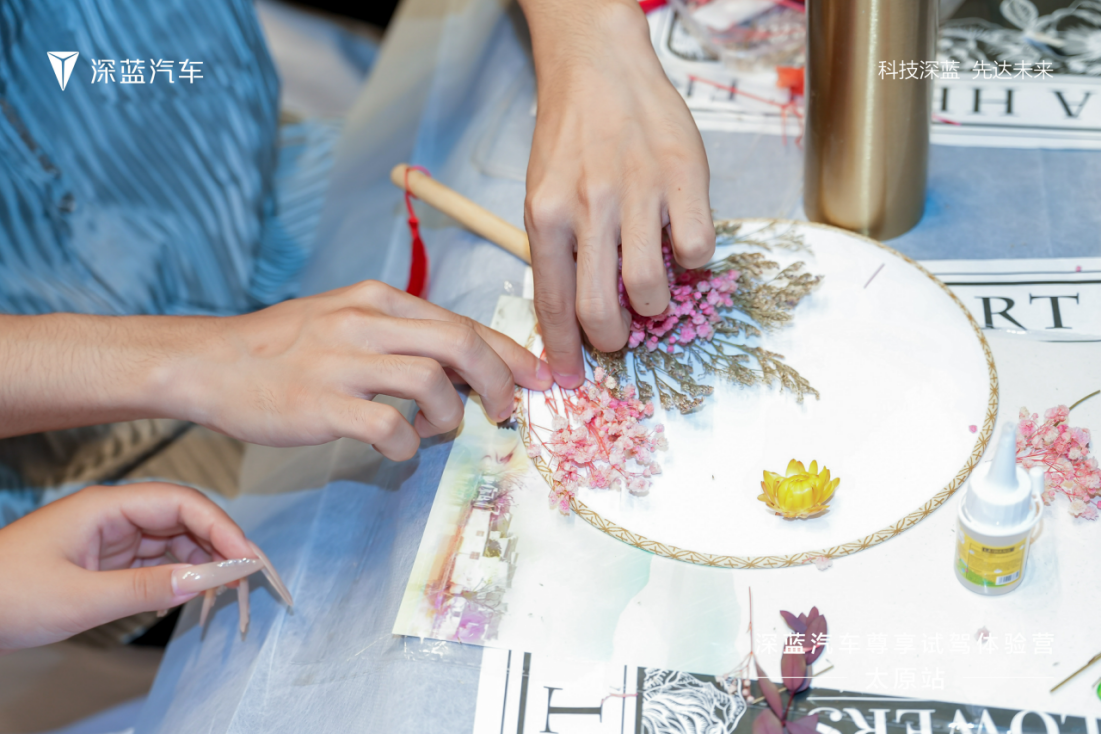 区别于传统试驾活动,本次体验营特别设置“匠心手作体验区”。嘉宾在专业老师指导下完成永生花团扇DIY,于一缠一绕间感受东方美学的静好时光,也体现出深蓝汽车致力于打造更有温度的用户体验。