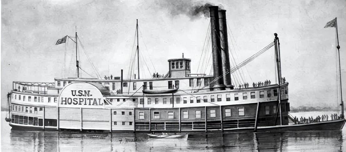 在美国南北战争时期,诞生了第一艘医院船“红色漫游者”号,它本身是一艘内河明轮渡船,后来被北军俘虏改装成医院船,在巨大的明轮罩外涂上了大大的“Hospital”字样。