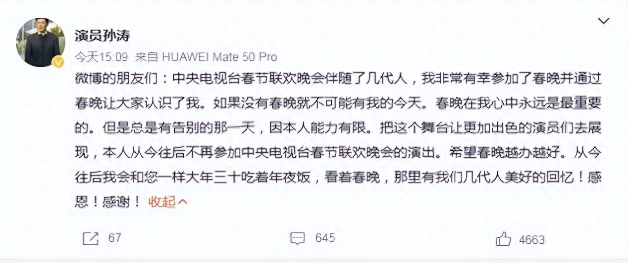 演员孙涛再度发声:因自己个人能力有限,宣布告别春晚