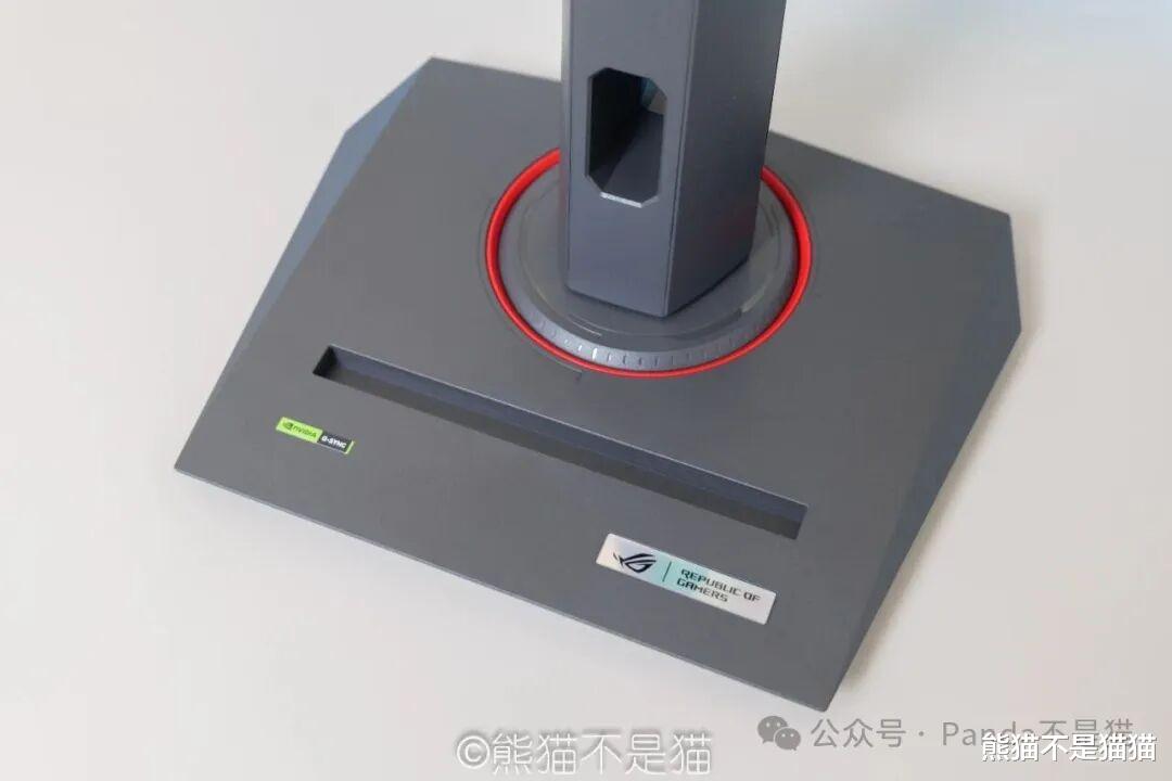 ROG绝梦25显示器底座是不规则方形的,底座右侧还有 ROG 的 LOGO 装饰条。底座和支架用的是免螺丝快拆设计,直接拿手拧就能组装好,方便得很。