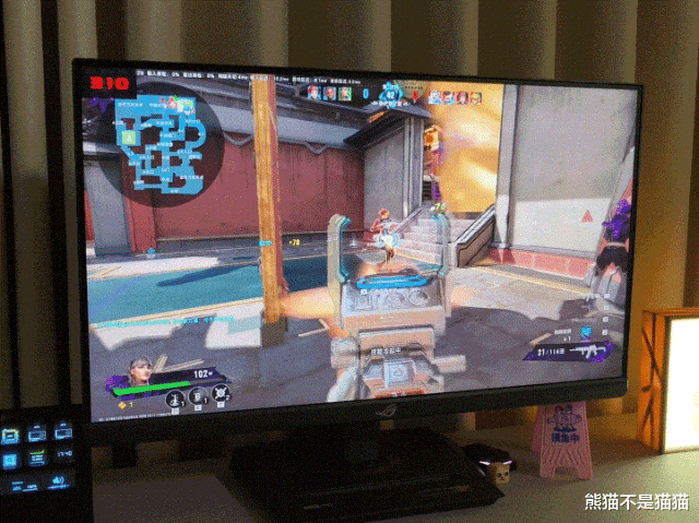 ROG 的游戏 AI 技术黑科技还真不少。熊猫用得比较多的就是 AI 动态准星。跟常规显示器提供的准星不一样,它能根据背景颜色的不同实时变化,一直保持自己是高亮状态,避免了背景和准星颜色一样造成的尴尬情况。