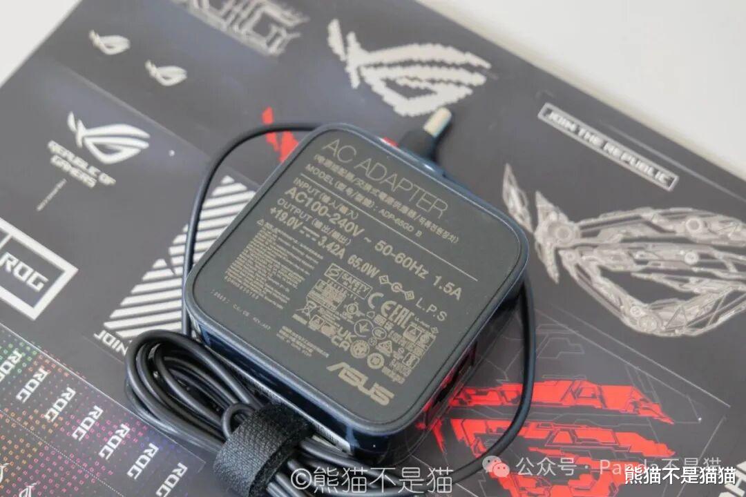 电源为65W的电源,支持100-240V的宽幅输入,对比常规的长条大块头,ROG用了方形设计,相较于长条状的适配器在收纳上是要方便很多。