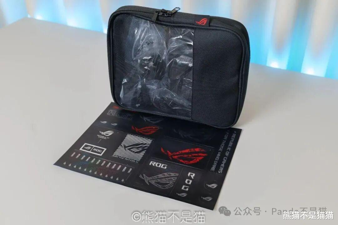 开箱展示先看配件,就觉得这体验感值了。ROG 用了专门的配件收纳包,还送了张 ROG 的信仰贴纸,在情绪价值这块儿,真是给用户拉满了。