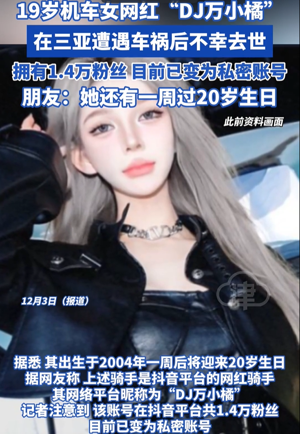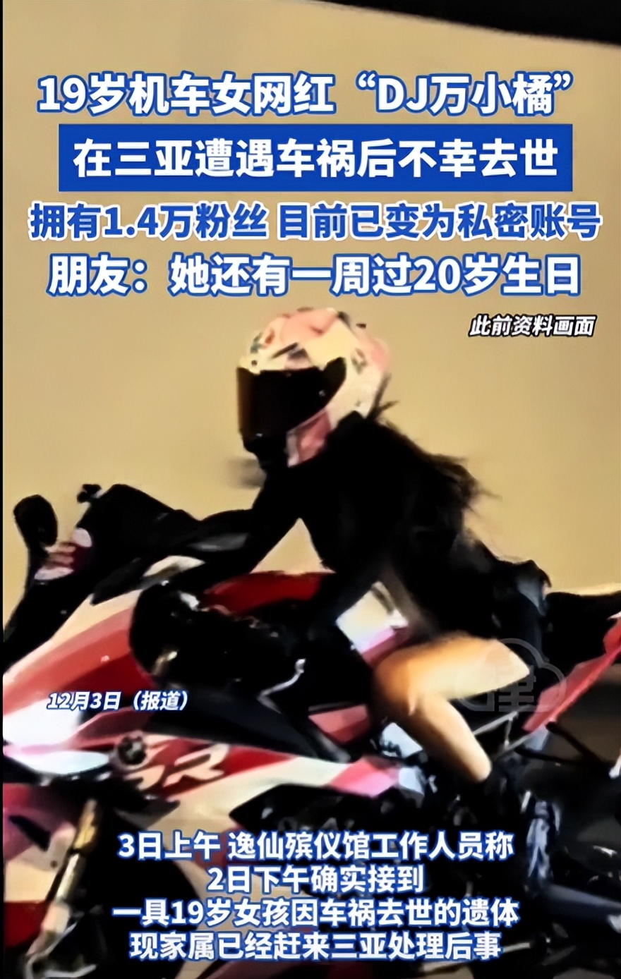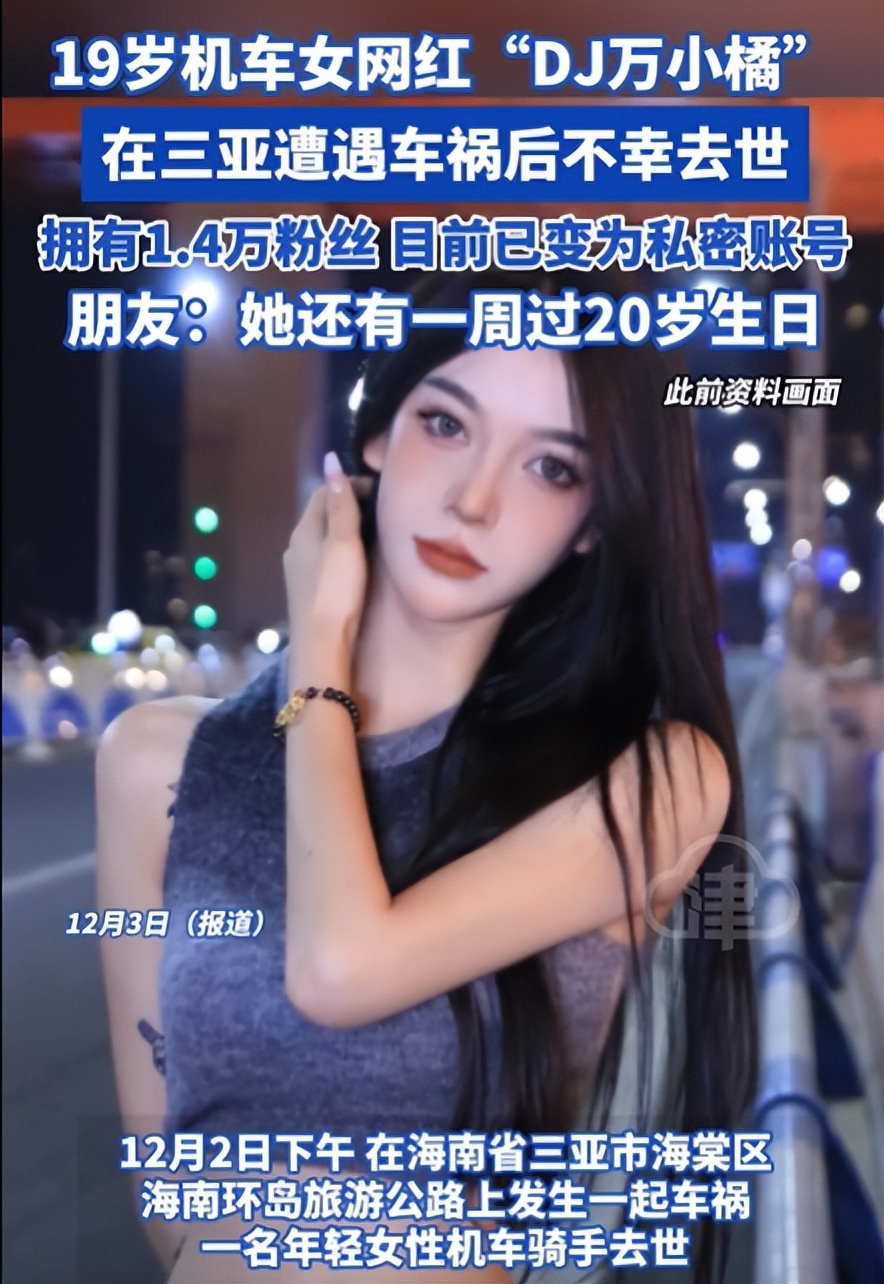 12月3日,据极目新闻报道称:12月2日,19岁机车女网红“DJ万小橘”在三亚骑行的时候,不幸遭遇车祸去世,其朋友称她还有一周才到20岁生日。