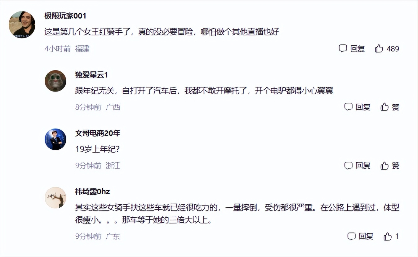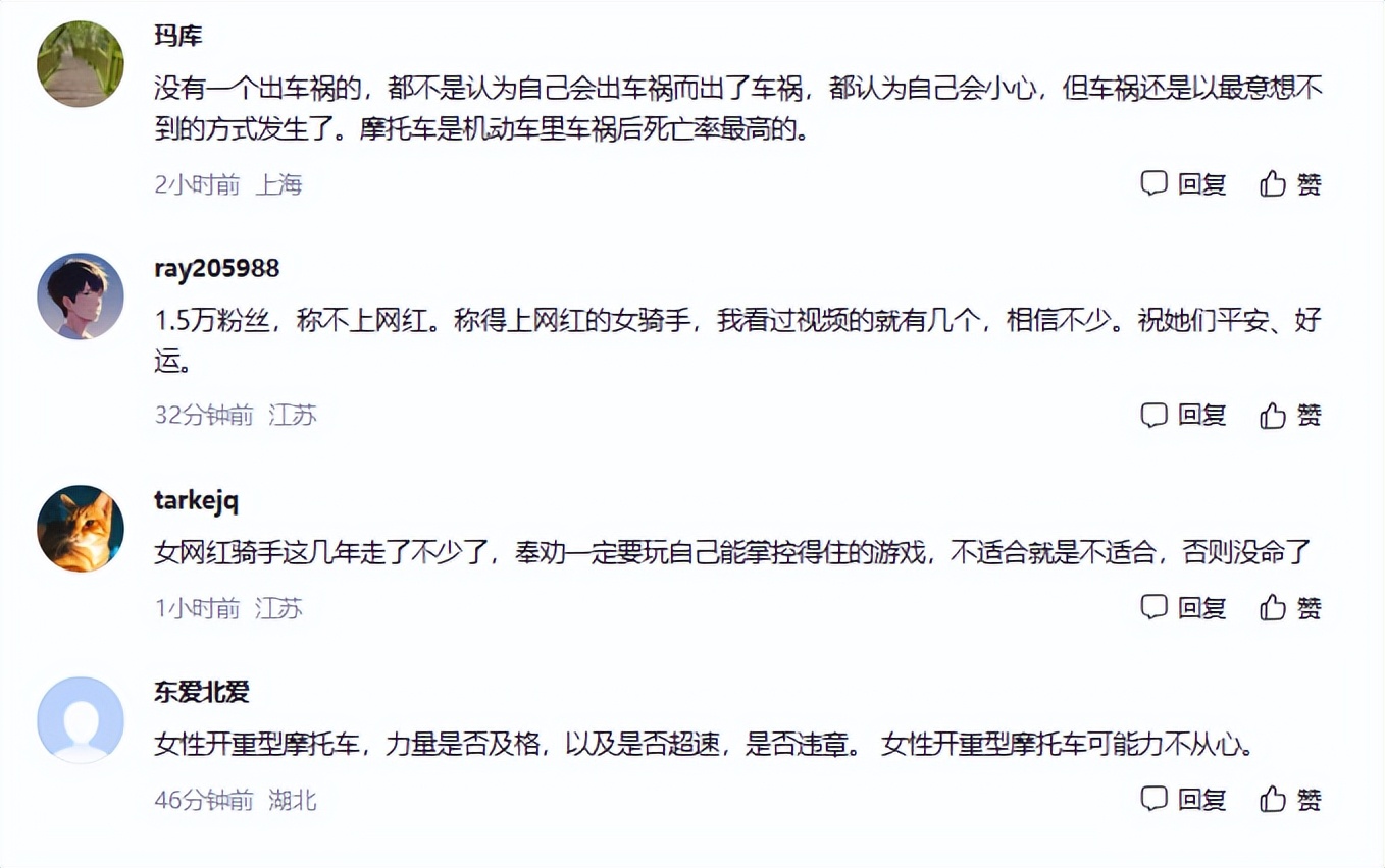 有网友表示,这是第几个女网红骑手了,真的没必要冒险,哪怕做个其他直播也好啊,而且也对于机车类的网红博主不理解也难以理解,并表示最近几年骑机车的网红博主们频频出事,这难道还不能给后来者一些警示吗?