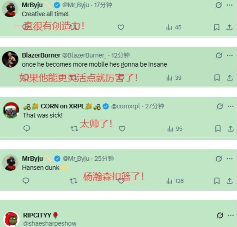 即便是这样,杨瀚森还是获得了美国球迷的认可,他们表达了杨瀚森有创造力。这里的创造力肯定就是因为他的策应能力,这对于他来说一直都是基本盘。而且在他扣篮和打进三分之后,也有球迷称赞。只是末节打完,估计美国球迷还是被指责。幸好杨瀚森私下的训练量一直都非常好,这有利于他的成长。只是目前的成长速度还是太慢了,杨瀚森需要抓紧再抓紧了。