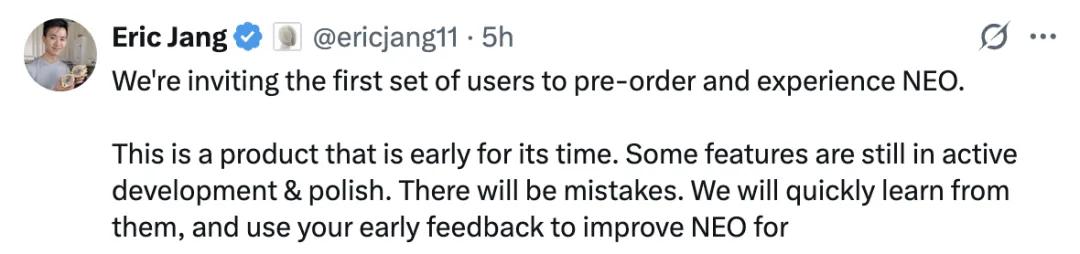 这是一款超前时代的产品。我们仍在积极开发和完善部分功能,可能会出现失误,我们会迅速汲取经验,并利用用户的早期反馈来改进NEO。