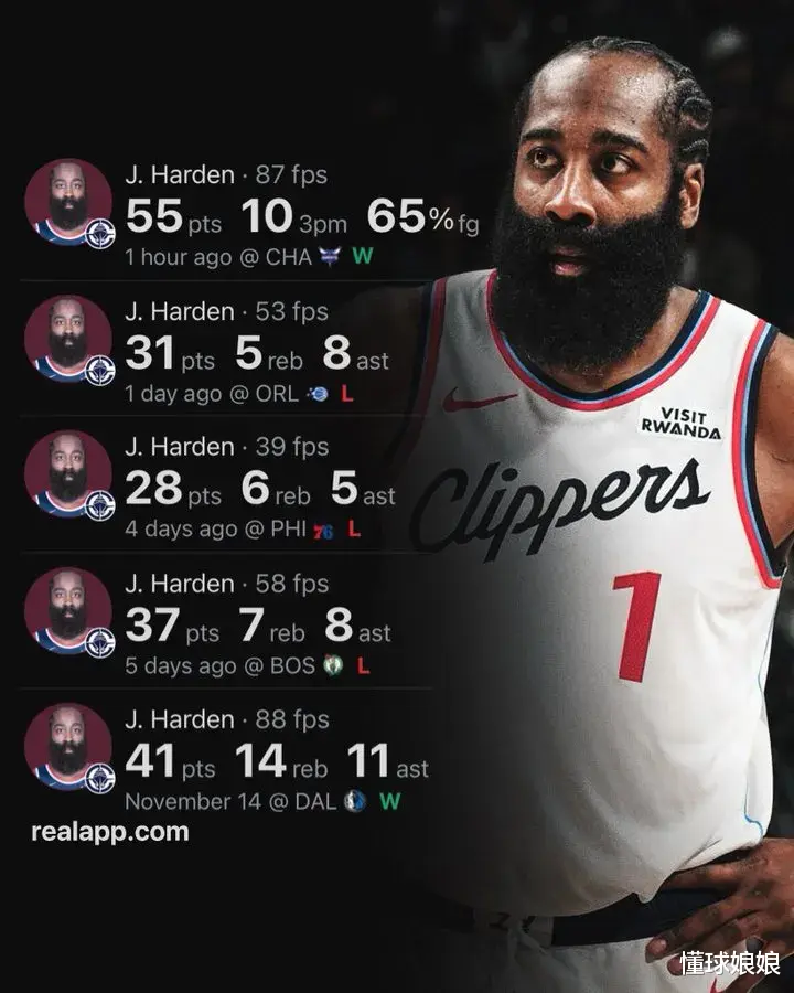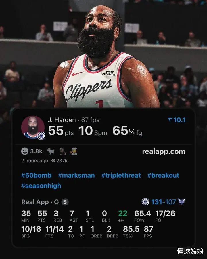 单场10记3分,平了自己的生涯纪录。单场55分啊,那更是创下快船队史单场得分纪录。哈登还有个火箭的61分,也是队史单场得分纪录。一个人拥有两支球队的队史单场得分纪录,这还是NBA历史第一次呢。赛后哈登风轻云淡的说:“我有很多场4+、50+,这一场有什么特别之处吗?”