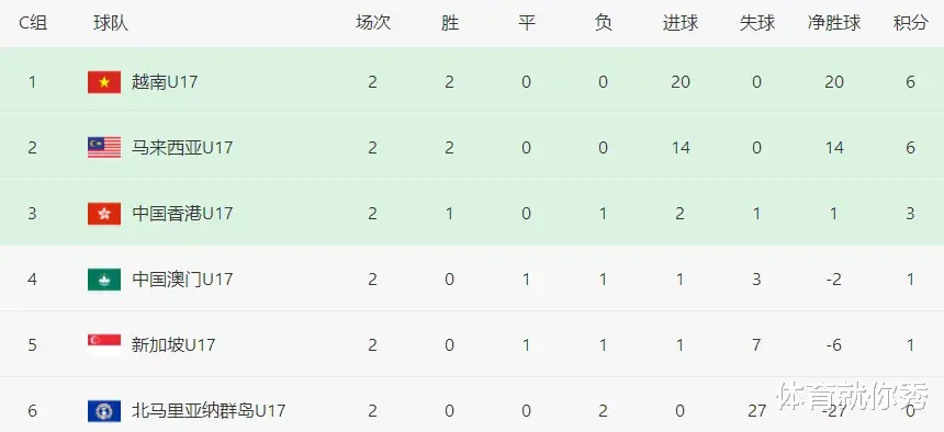 凭借着这场大胜,国足在净胜球上,也以18个净胜球的优势,暂时反超孟加拉国,登上了A组的小组第一,而在明晚19点35分,国足还将对阵小组赛的另一个弱旅文莱,这场比赛不出意外的话,又将是一场大胜。但在C组的一场比赛中,还有一支球队比U17国足还要猛,那就是曾经的鱼腩球队越南队,最近这些年越南队的实力也是大幅提升,还曾经在世预赛中击败过中国队!这次越南队也是来势汹汹,他们在C组的实力独居一档,首轮比赛就6-0大胜新加坡队,而昨晚与北马里亚纳群岛的比赛中,越南队和国足一样,上半场打进6球,全场比赛最终也是14-0狂胜对手,2轮比赛打进了10球,越南队也是目前攻击力最猛的球队。