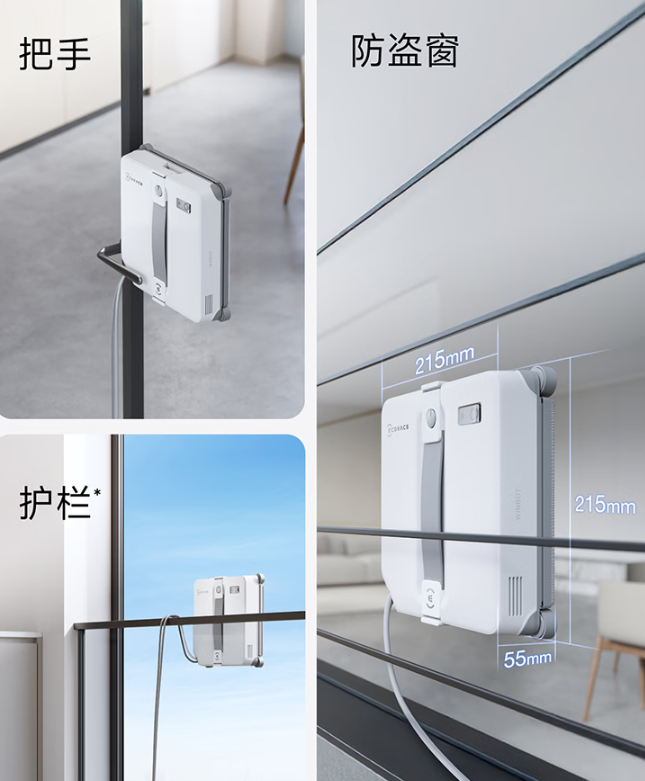 防跌落传感器机身周边的传感器能识别玻璃边缘,及时调头,防止跌落。标配安全绳,作为最后一道物理保险。搭载一个单风机真空电机,足以应对普通家庭的平板玻璃。不过对于干涸的鸟粪,胶印难以一次清除,可能需要人工预处理。