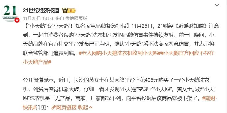 对于有消费者误购“小天鸥”洗衣机的事件,小天鹅品牌在社交平台发布声明称,小天鸥”与公司小天鹅品牌毫无关联,并联合市监部门、电商平台展开全面调查,收集证据,启动法律程序,坚决对涉及侵权仿冒的商家追责。