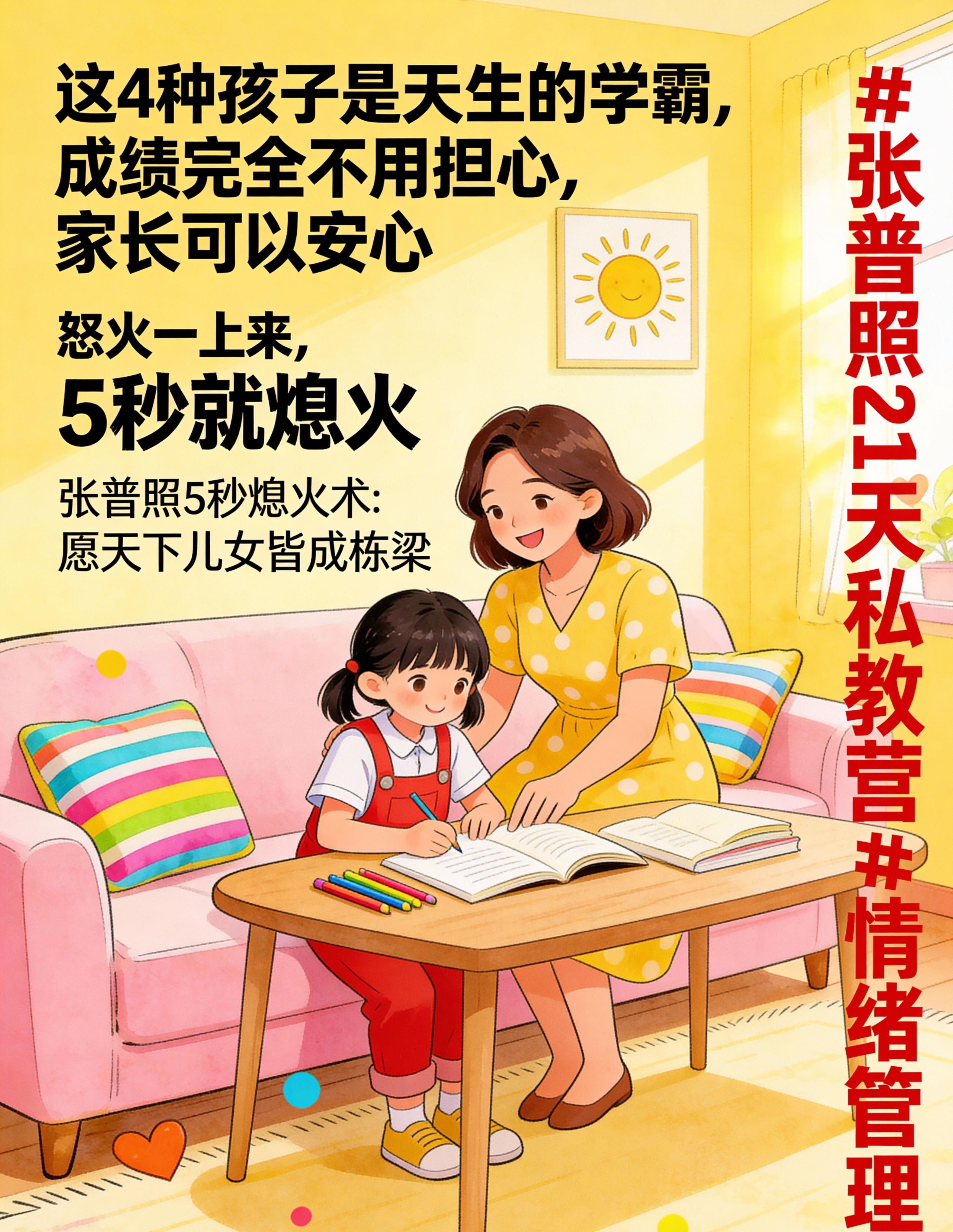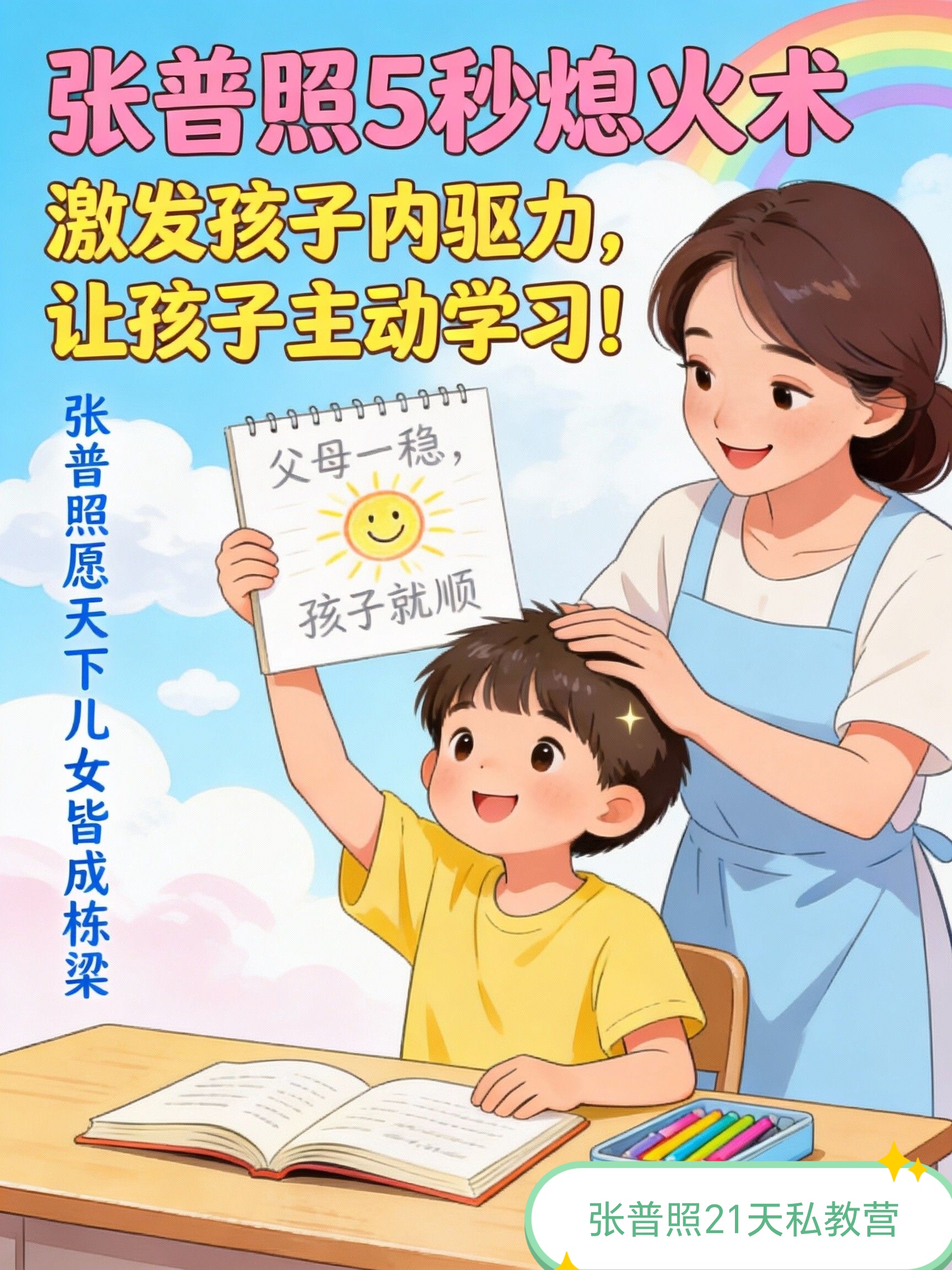 现在练习张普照5秒熄火术之后: 孩子作业磨蹭 → 你自动启动5秒熄火 → 内心恢复平静与信任 → 能理智决定是提醒还是放手 → 孩子感受到空间与信任,更易进入自主学习状态。