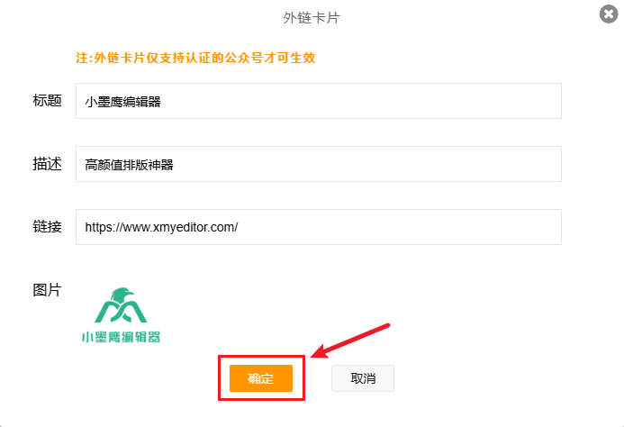 第七步:在弹出的“外链卡片”弹窗中填写标题、描述、链接、图片相关信息,填写完成后点击确定;