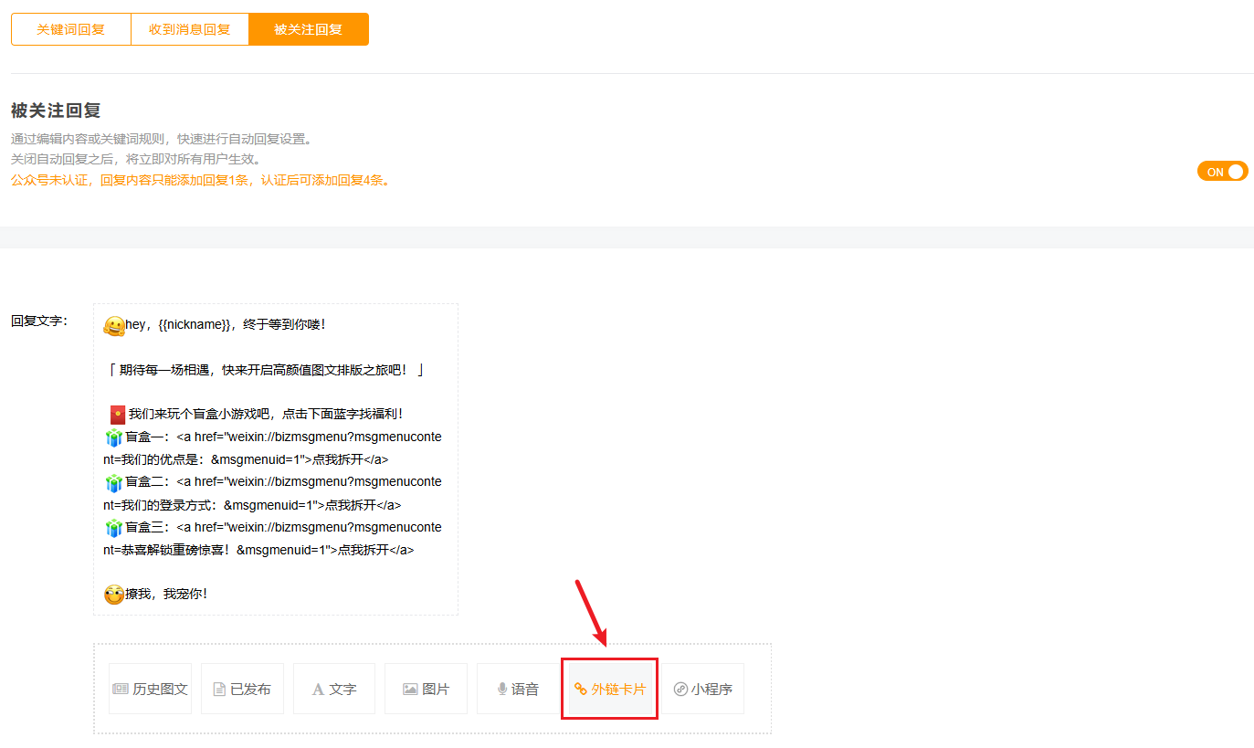 在小墨鹰编辑器中,合理设置公众号的“自动回复”功能能够有效提升与用户的互动效率,增强用户体验。其中,将 “被关注回复” 设置为 “外链卡片”,可以引导新关注用户快速访问特定网页,实现高效引流和信息传递。以下为您详细介绍设置步骤:
