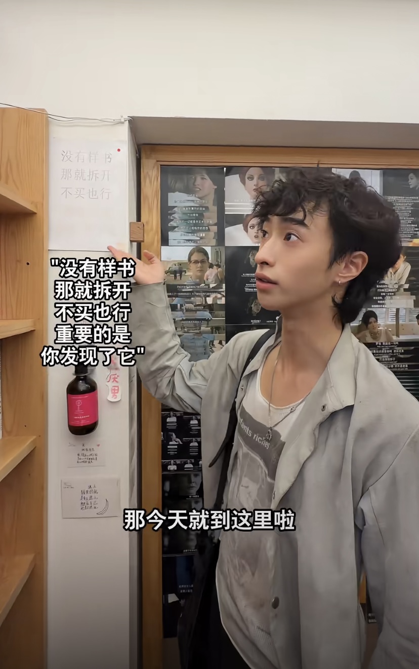 他被这个书店暖到了,因为标语上写着“没有样书、那就拆开,不买也行,重要的是你发现了它”。这么暖心的话,让读书者爱书,也更愿意去守护这一份美好。