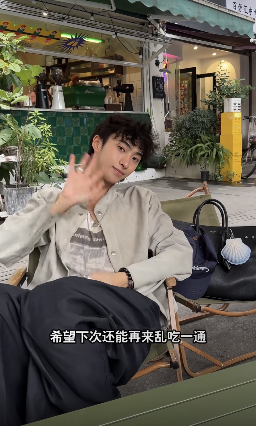 当天恩利穿了一件浅色夹克外套、配了高腰的阔腿裤,背了一个单肩包。手机、证件之类的都装在包里,双手就可以解放出来拿美食。