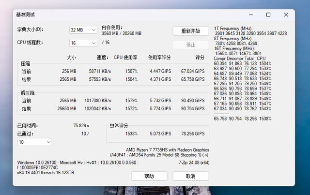 作为一台办公电脑,一天之中压缩、解压缩多少个文件都不奇怪。用7-ZIP对EQR6进行基准测试,最终得分为78.256GIPS,表现相当可以。