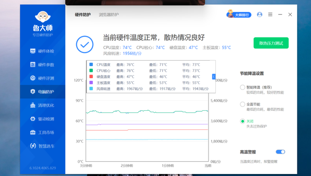 娱乐大师烤机15分钟,CPU温度最高来到76°C,主板温度最高55°C,硬盘温度最高47°C。由于MSC 2.0散热系统空气由底部进入主机,依次经过SSD散热鳍片、内存>>主板>>CPU,大体呈先发热低、后发热高走向,因此温度控制相当到位,充分确保长时间高负载的稳定性以及性能的持续释放。