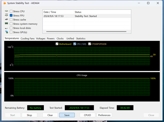 AIDA64勾选压力最大的FPU进行单烤,经过40多分钟测试后,所有硬件温度几乎都维持在一条直线,也没有因温度过高而降频的情况出现,整体表现相当不错。
