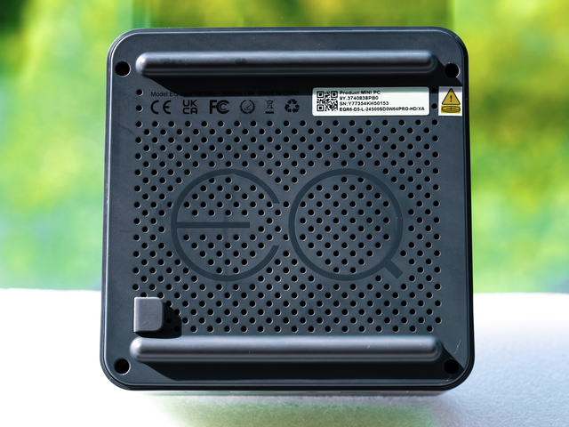 ▲虽然绝大多数情况下使用电脑时根本看不到底部,但零刻EQR6的底部面板还是充满了各种小细节——由于搭载了零刻家全新的MSC 2.0散热系统,所以它的底部面板上布满了密密麻麻的散热孔,但或许是为了降低产生密恐的概率,它还在散热孔之间留了大大的EQ二字;两条长条脚垫比一般Mini PC的略高一筹,既能有效起到防滑作用,又能有利于主机吸入冷风;四枚固定螺丝都有胶垫覆盖隐藏,零刻祖传的辅助拆机硅胶提手依旧还在,有需求拆机时超级方便。