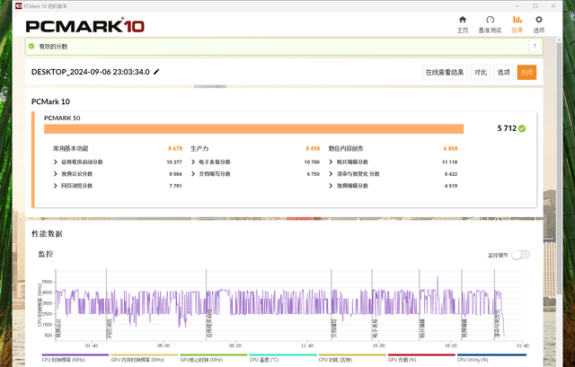 既然定位于办公,那必须来一波PCMARK 10模拟办公体验呀。零刻EQR6最终综合得分5712,整体战胜59%的用户,几乎追平搭载Core i7-1360P的商务办公本。其中,基本功能得分8678,生产力得分8498,数字内容创作得分6858,用它日常办公绰绰有余。