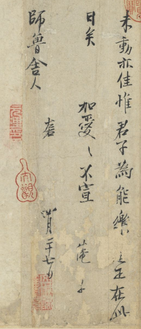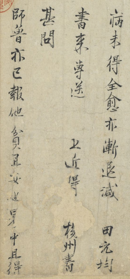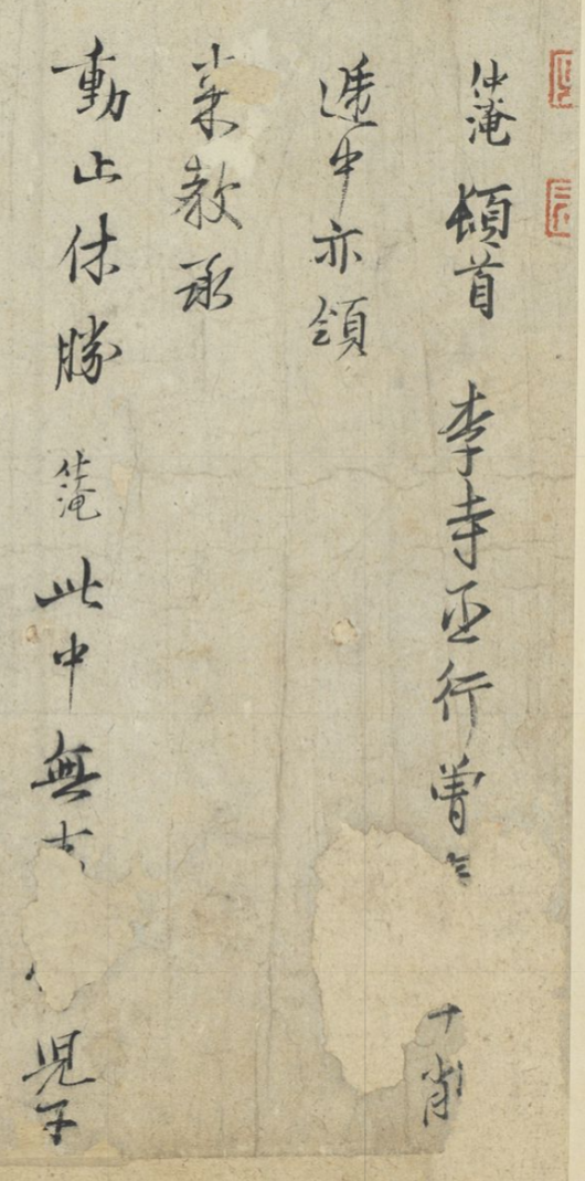 释文:仲淹顿首。李寺丞行。曾□□□□递中。亦领来教。承动止休胜。仲淹此中无□□。儿子病未得全愈。亦渐退减。田元均书来。专送上。近得扬州书。甚问师鲁。亦已报他贫且安也。暑中且得未动亦佳。惟君子为能乐□。正在此日矣。加爱。加爱。不宣。仲淹□。师鲁舍人左右。四月二十七日。