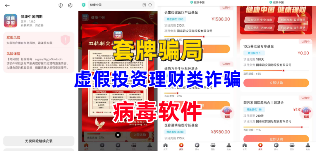 虚假投资理财。不法分子冒充“国泰君安”公司的名义,打着“人人持币,共同富裕”的旗号,制作散布涉诈APP,虚构推广“10万养老金专享基金”“颐养家园医养结合主题基金”“健源生物医药成长基金”“长生优健医疗产业基金”“细胞方舟生物科技基金”等高额返利理财项目实施诈骗。