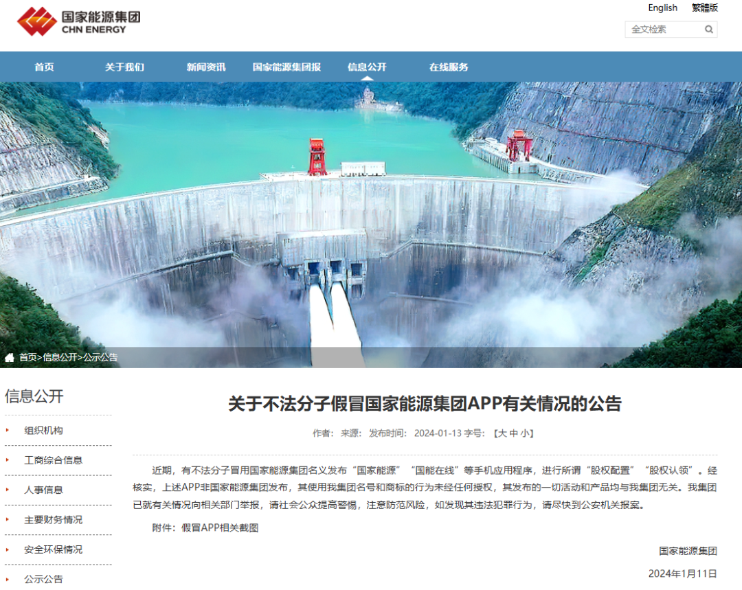 套牌骗局,不法分子冒充“国家能源集团”公司的名义,制作散布涉诈APP,虚构推广高额返利理财项目实施诈骗。