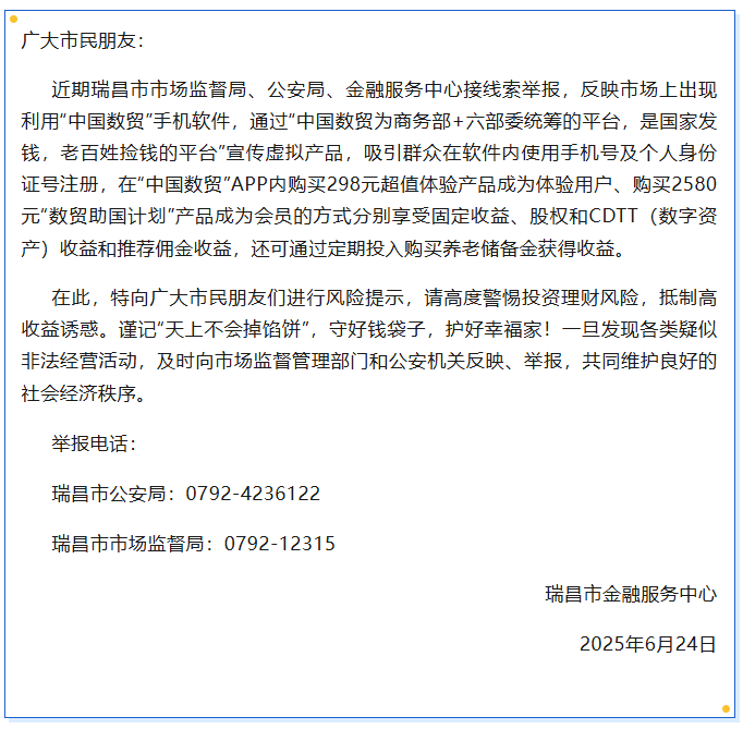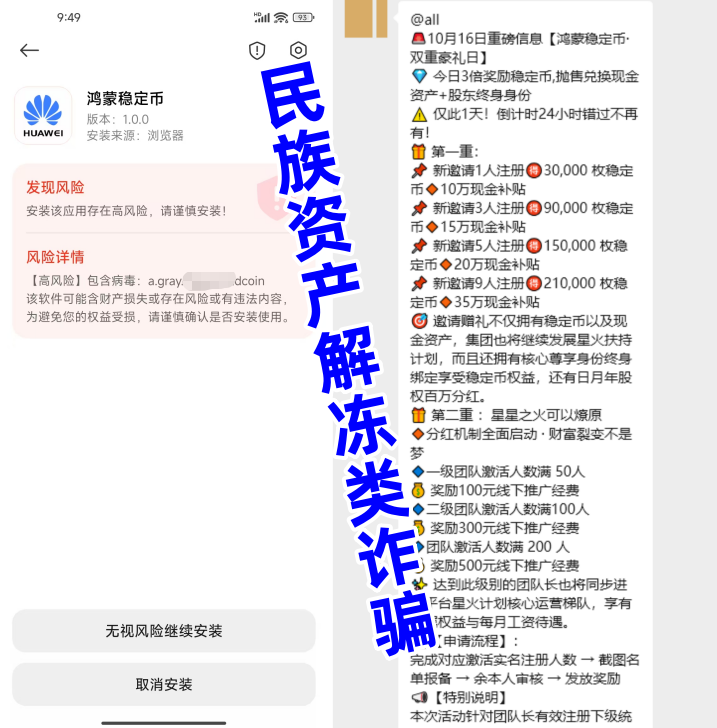 近期,以“数字资产”“国家平台”“高额返利”为诱饵的诈骗活动频繁出现,不法分子通过伪造国家机关或知名企业名义,精心包装各类虚假投资理财项目,诱骗公众下载涉诈APP并投入资金。